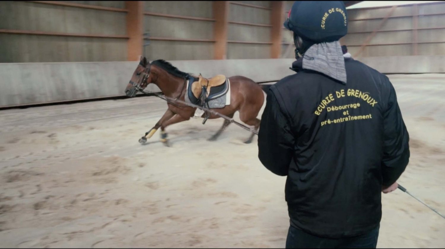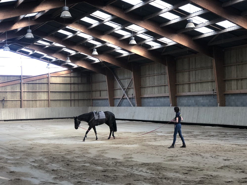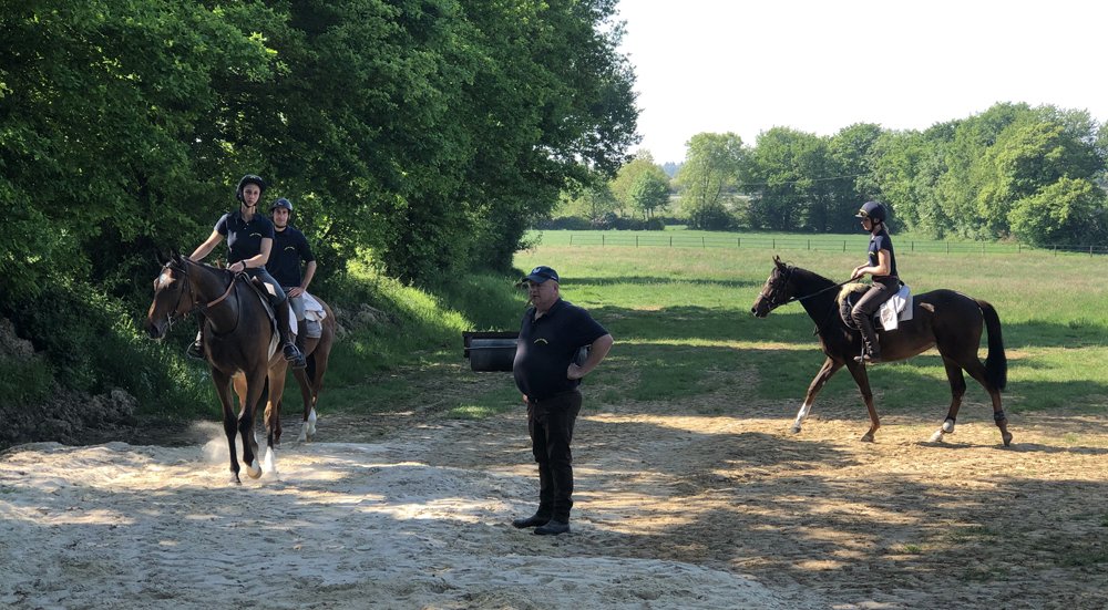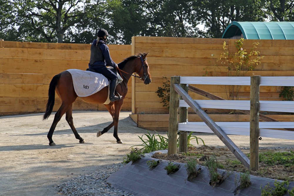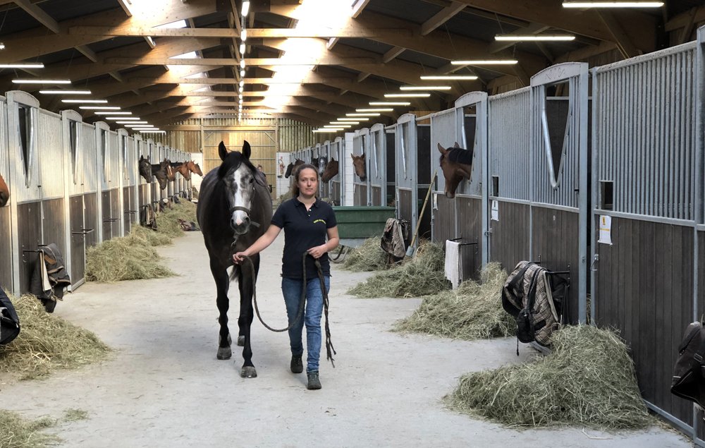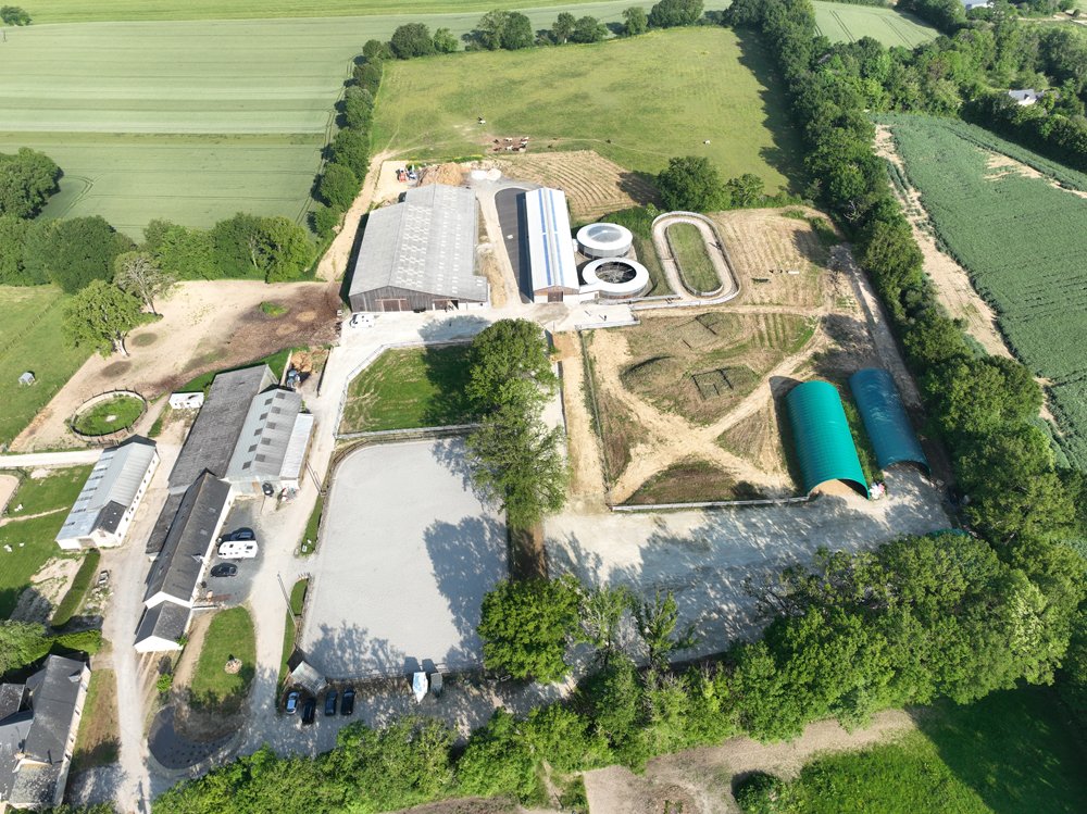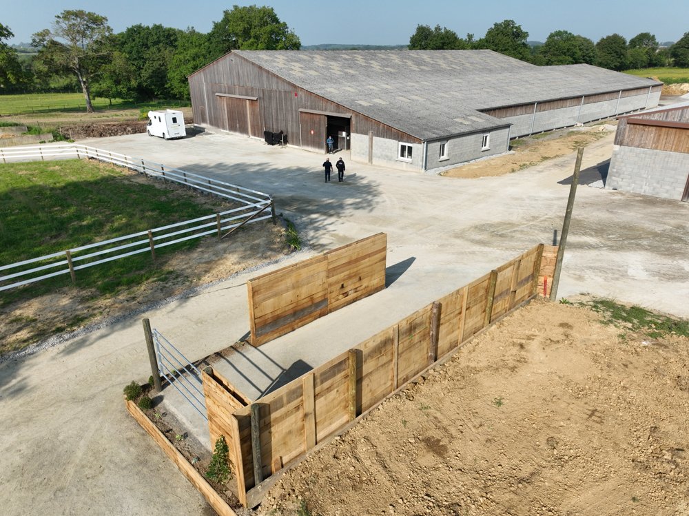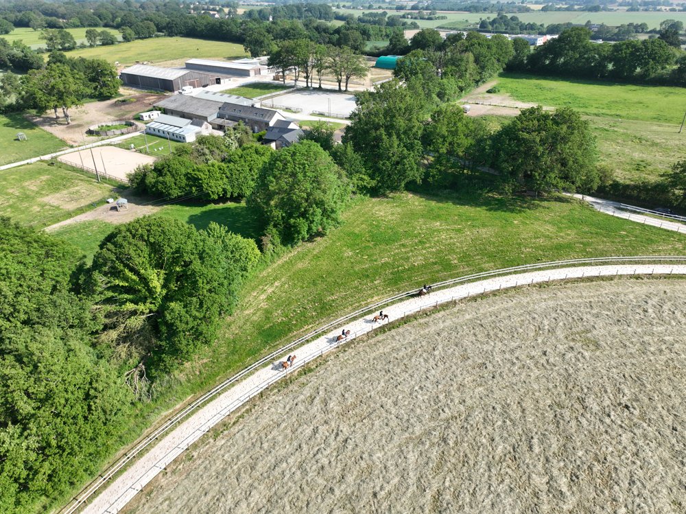 L'Ecurie de Grenoux s'étend sur 30 hectares d'un seul tenant à Saint-Berthevin, près de Laval en Mayenne. Une piste de 1200 m a été tracée avec du sable de chez Guimard. La piste est en dénivelé, avec 2 lignes droites de 400 m. Les structures ont été améliorées en 2017 avec la construction d'un vaste bâtiment abritant 31 boxes ainsi qu'un marcheur 6 places et un grand manège couvert de 1000 m2 qui permet de sortir les chevaux à l'abri même en cas de forte intempérie. Pour répondre à la demande croissante, l'Ecurie de Grenoux a ériger un nouveau barn en parallèle du premier, comme une copie améliorée. Ce nouveau bâtiment comporte 30 boxes encadrant un couloir plus large, et y sont collés 1 marcheur couvert ainsi qu'un rond de long également couvert mais très bien aéré et même arrosé automatiquement de l'intérieur ! Le débourrage est effectué par une seule personne au sol puis à cheval. Toutes les manipulations sont tout d'abord réalisées au box, puis dans le manège couvert, en reprenant à chaque fois toutes les opérations à zéro. Dès que le jeune cheval est monté, il effectue des exercices dans le manège puis dans la grande carrière extérieure, emmené par un poney leader. Une fois bien mis, le cheval pourra s'exercer et commencer son pré-entrainement. La remise en forme, comme le pré-entrainement proprement dit, est réalisé à la carte selon les demandes des propriétaires ou des entraineurs, au niveau du fond ou de la vitesse. La fluidité du dessin de la piste permet en effet d'avancer sérieusement les pensionnaires si le propriétaire le souhaite. Dans le cadre d'une écurie de jeunes chevaux où les mouvements sont fréquents, l'équipe d'une 10aine de personnes porte une attention toute particulière à l'hygiène. Les nouveaux pensionnaires sont tous placés dans les boxes de quarantaine en arrivant. Les chevaux ont tous leur propre tapis et torchon de sangle, lavés une fois par semaine. De même, tous les harnachement sont désinfectés entre chaque lot. Par ailleurs, Audrey de Clerck, qui effectue minutieusement tous les soins, remplit des fiches de renseignement au quotidien pour chaque pensionnaire, au terme sanitaire, niveau de travail et comportement. En effet, une personne s'est spécialisée dans la sensibilisation, qui permet en seulement 2 ou 3 séances de rendre un poulain serein face aux éléments extérieurs inattendus. Capacité de 80 boxes : 1 barn de 31 boxes 3.50m x 3.50m 1 barn de 30 boxes idem Barn de quarantaine de 13 boxes entièrement rénovés 6 boxes extérieurs 1 grand manège couvert de 20x50 m 1 rond de long couvert avec arrosage 2 marcheurs automatiques de 6 places couverts 1 carrière extérieure de 30x60m 1 piste de 1200 m en sable Guimard avec 2 lignes droite de 400 mètres Clôtures Horse Rail sur toute la structure