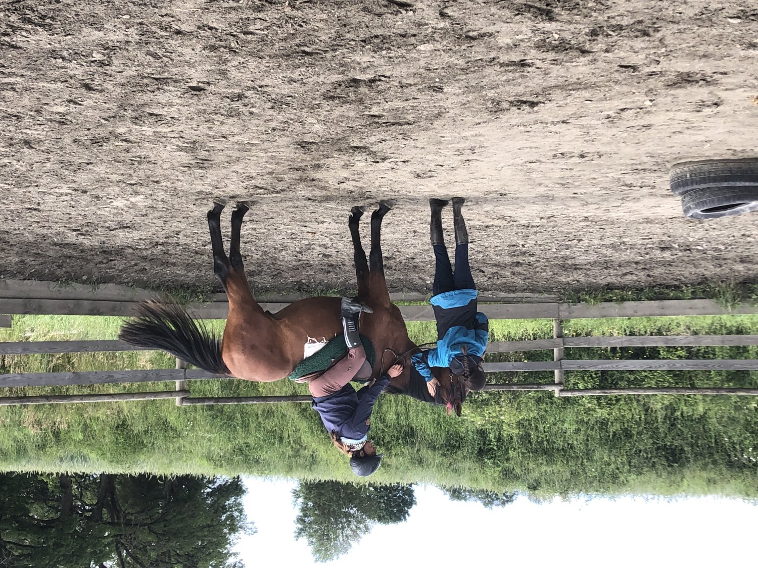 Seconde étape : en selle, une fois la direction et l’arrêt acquis, le jeune cheval va alors continuer son « éducation » en extérieur ce qui lui permet d'acquérir le mental et le physique pour ensuite progressivement introduire la piste..