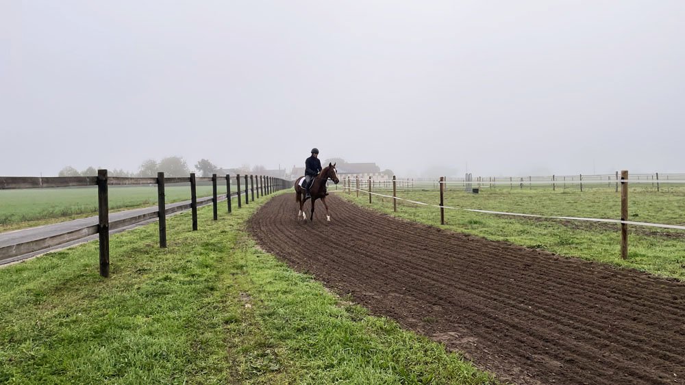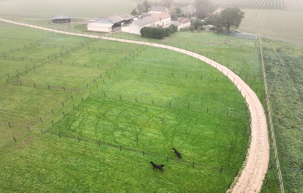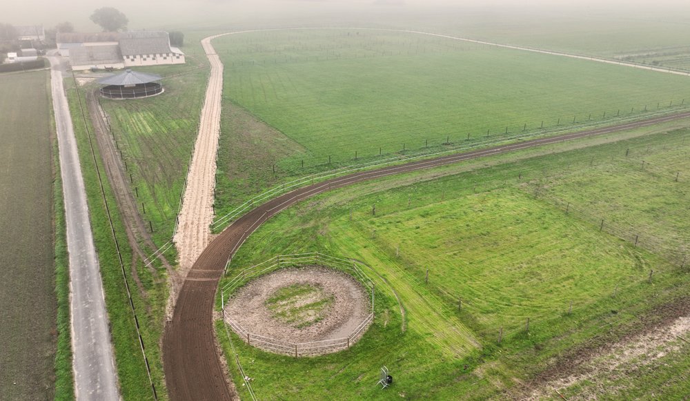 Deux pistes ont été tracées: un grande piste de 850 m avec dénivelé, et une piste ovale de 600. A l'intérieur de la grande piste 18 paddocks de 25mx25m ont été cloturés. Avec un tel nombre, les chevaux peuvent sortir tous les jours dans des paddocks différents qui peuvent aisi rester verts. Par ailleurs, 2 grands paddocks de 6000 m2 sont sont prévus pour les chevaux de repos, qui alternent leurs journées entre le box et le pré.